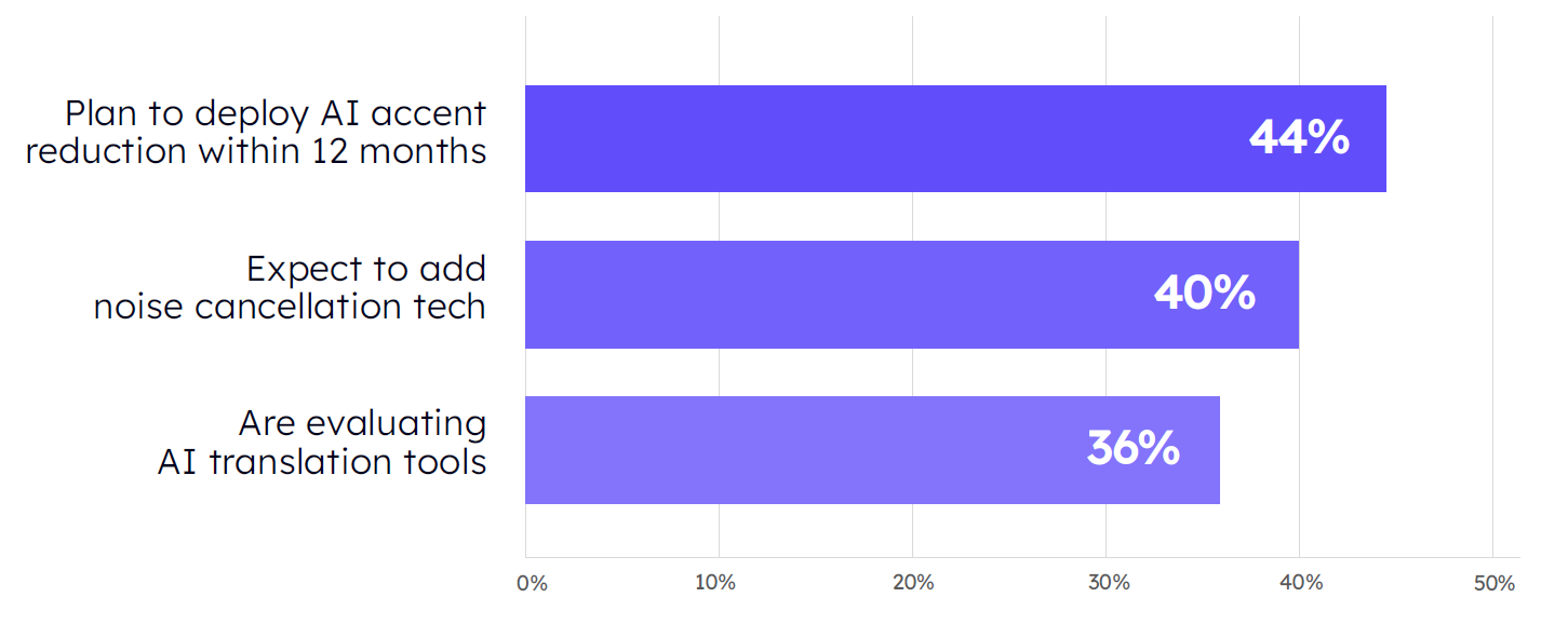The next 6–12 months will be decisive. Large portions of CX leaders plan to roll out AI accent reduction, translation, and noise suppression in the short term. This signals a market ready to modernize voice infrastructure fast.