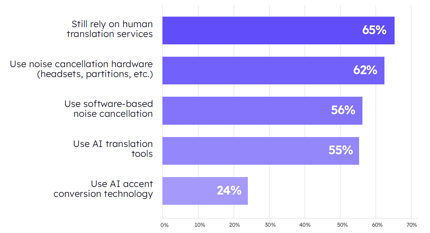 The data shows a sharp divide. Many contact centers have adopted modern AI solutions like noise cancellation software, translation, or accent conversion, but most still rely heavily on labor-intensive fixes like human translators or expensive hardware.
