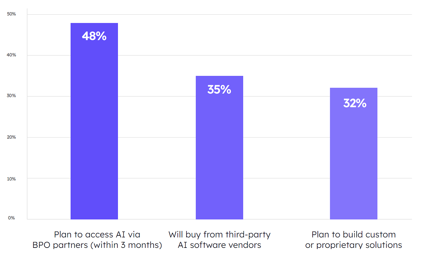 Nearly half of enterprises say they’ll access AI through BPO partners in the near term. It’s seen as the fastest path forward, but it comes with trade-offs: less control, less flexibility, and higher long-term risk.